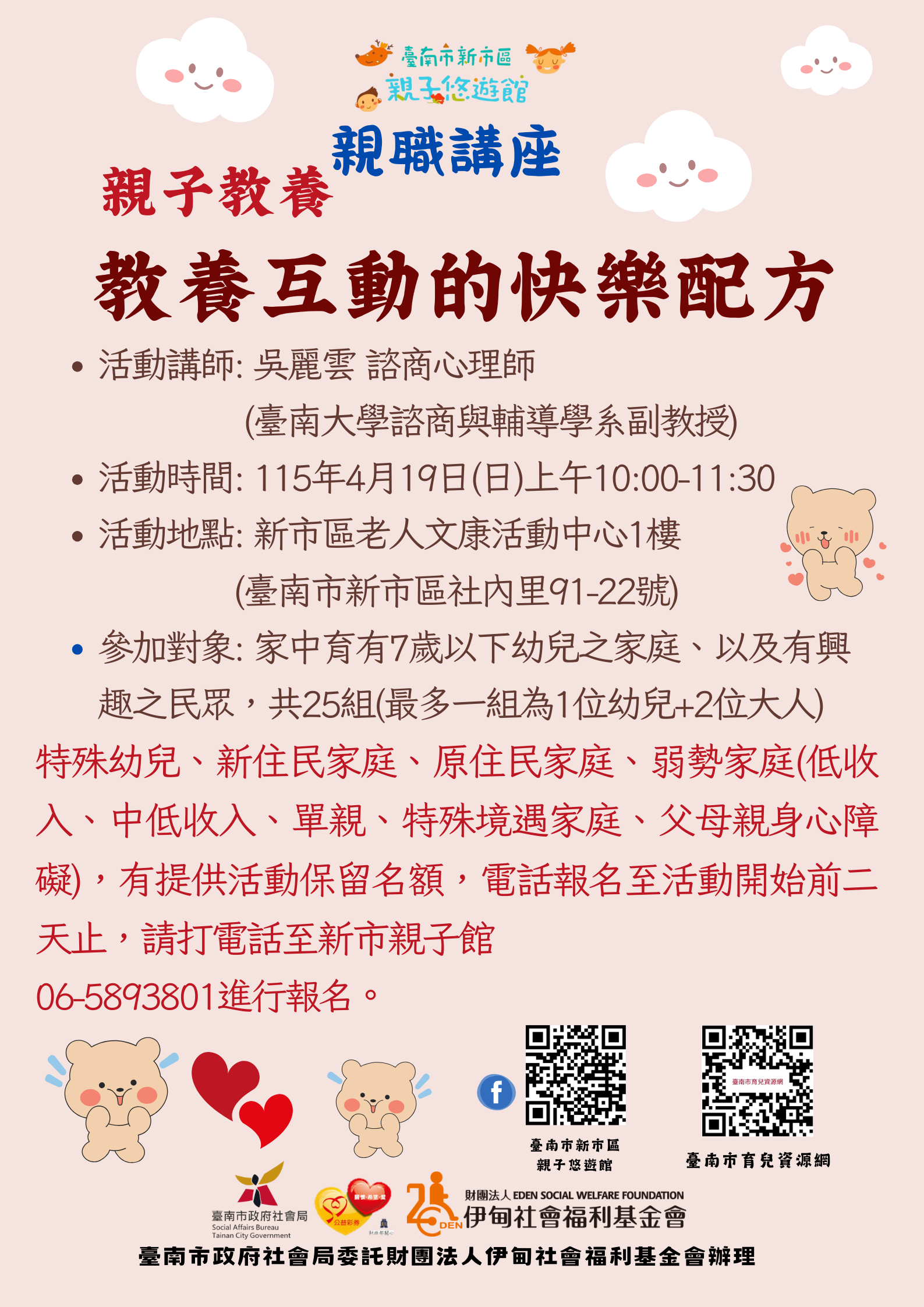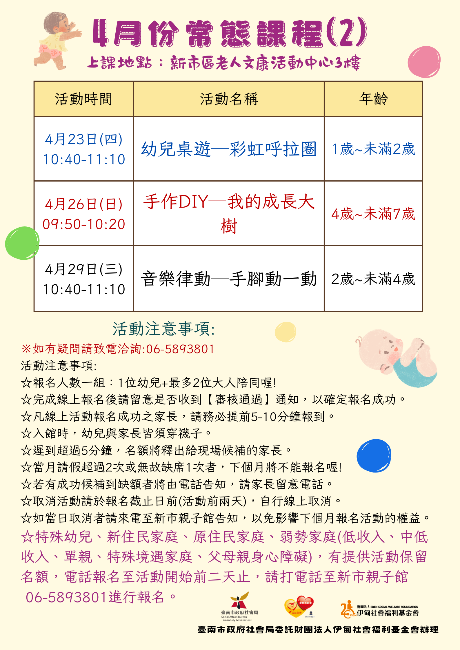 ☆特殊幼兒、新住民家庭、原住民家庭、弱勢家庭(低收入、中低收入、單親、特殊境遇家庭、父母親身心障礙),有提供活動保留名額,電話報名至活動開始前二天止,請打電話至新市親子館 06-5893801進行報名。※如有疑問請致電洽詢:06-5893801